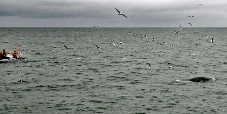 Auf der anderen Hafenseite startet ein Schlauchboot mit Touristen, die wie Feuerwehrleute verkleidet wurden. Wahrscheinlich wissen die Insassen nicht, dass die Wellen des Nordatlantiks kräftig zuschlagen, wenn sich das Boot mit hoher Geschwindigkeit den Walen nähert. Wahrscheinlich wissen sie auch nicht, dass sie alle pitschnass dabei werden. Wir sind jedenfalls froh, dass wir nicht die nächsten 3 Stunden so hintereinander eingepfercht sitzen müssen, sondern auf der "Andrea" ein bisschen mehr Bewegungsfreiheit genießen.Sehr positiv finden wir, dass wir auf dem Schiff in die bereitgestellten und wasserdichten Overalls schlüpfen können, die ganz hilfreich bei der Walbeobachtung auf dem Oberdeck sind, denn der Wind ist kühl und kräftig, obwohl das Meer ruhig und der Wellengang nicht sehr hoch ist. Unsere dreistündige Tour mit dem Walbeobachtungsboot ist sehr informativ, weil die begleitende Meeresbiologin Annika alles sehr sachkundig in englisch und deutsch erklärt. Nach langer Suche entdecken wir tatsächlich einige Zwergwale, die Lust haben, mal ab und zu aufzutauchen. Leider verschwinden sie so schnell, dass man nur die Rückenflosse zu sehen bekommt. Mir gelingen gerade mal 4 Fotos, auf denen etwas von einem Wal zu sehen ist. Auf der Rückfahrt erklärt Annika noch einige Walknochen, die man anfassen oder mit denen man sich fotografieren lassen kann.