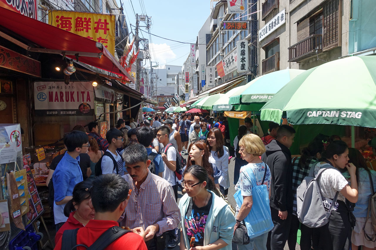 Zwischen den Läden und Verkaufsständen gibt es unheimlich viele Restaurants. Meist befindet sich vorn ein Verkaufsstand, an dem die Kunden die Fische aussuchen. Dann werden die für sie zubereitet und hinten im Restaurant an Tischen serviert. Alle Restaurants sind bereits zu dieser Zeit am Morgen gut besucht, weil die Japaner viel Fisch zum Frühstück essen. Wir schlendern durch die engen Gassen und wundern uns, dass es weder nach Fisch riecht noch stinkt. Nicht wie in Thailand oder in China.