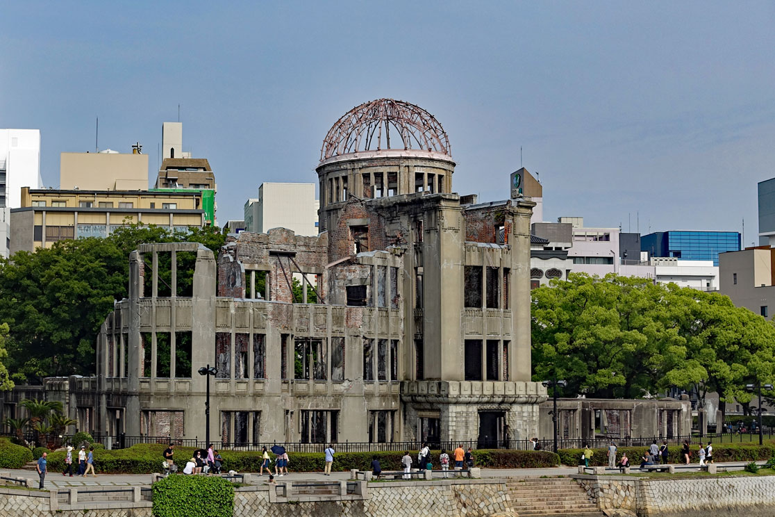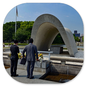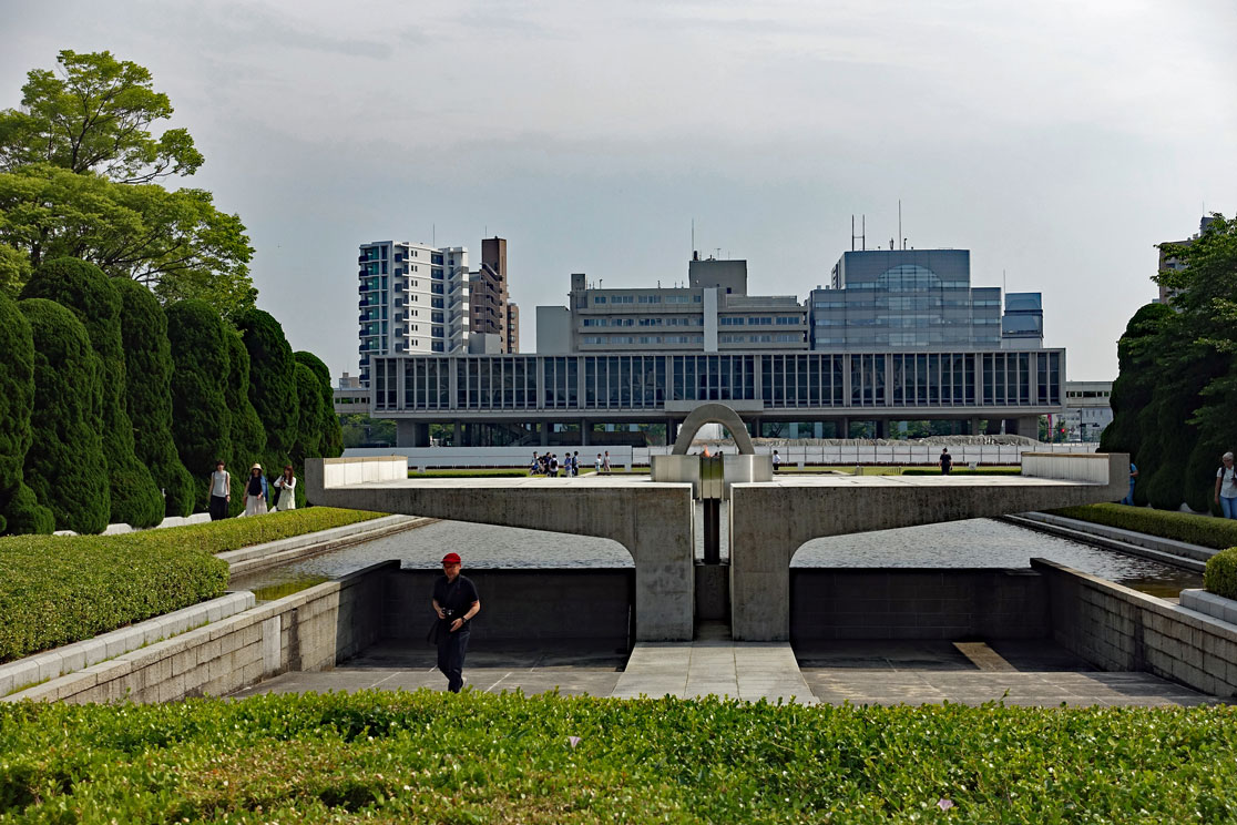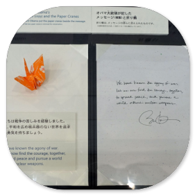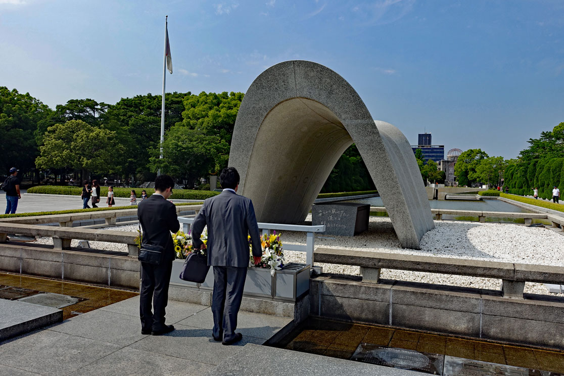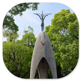 Gegen 14:15 Uhr sind wir im Zentrum von Hiroshima und besichtigen den Friedenspark. Der ist sehr beeindruckend. Vor allem das Museum ist sehr informativ, das wir zuerst besuchen. Viele Dokumente mit eindringlichen Fotos, Zeitzeugenaussagen und Videos zu dem Atombombenabwurf im August 1945 sind dort zu sehen und zeigen die Botschaft des japanischen Staates, dass man sich wünscht, dass so etwas nie wieder passieren darf. Wir spazieren durch die abgedunkelten Räume und schauen uns die beklemmenden Bilder an. Manche Darstellungen sind grauenhaft und es sind auch Gegenstände ausgestellt, die man anfassen darf, so die Limonadenflasche, die durch die Hitzewelle so verformt wurde, dass das Glas fast geschmolzen wäre. Da kann man sich vorstellen, was mit den Menschen passiert ist, die davon erfasst wurden.Mir hat auch die Botschaft von Präsident Obama gefallen, der 2016 Hiroshima besucht hat und dazu geschrieben hat: