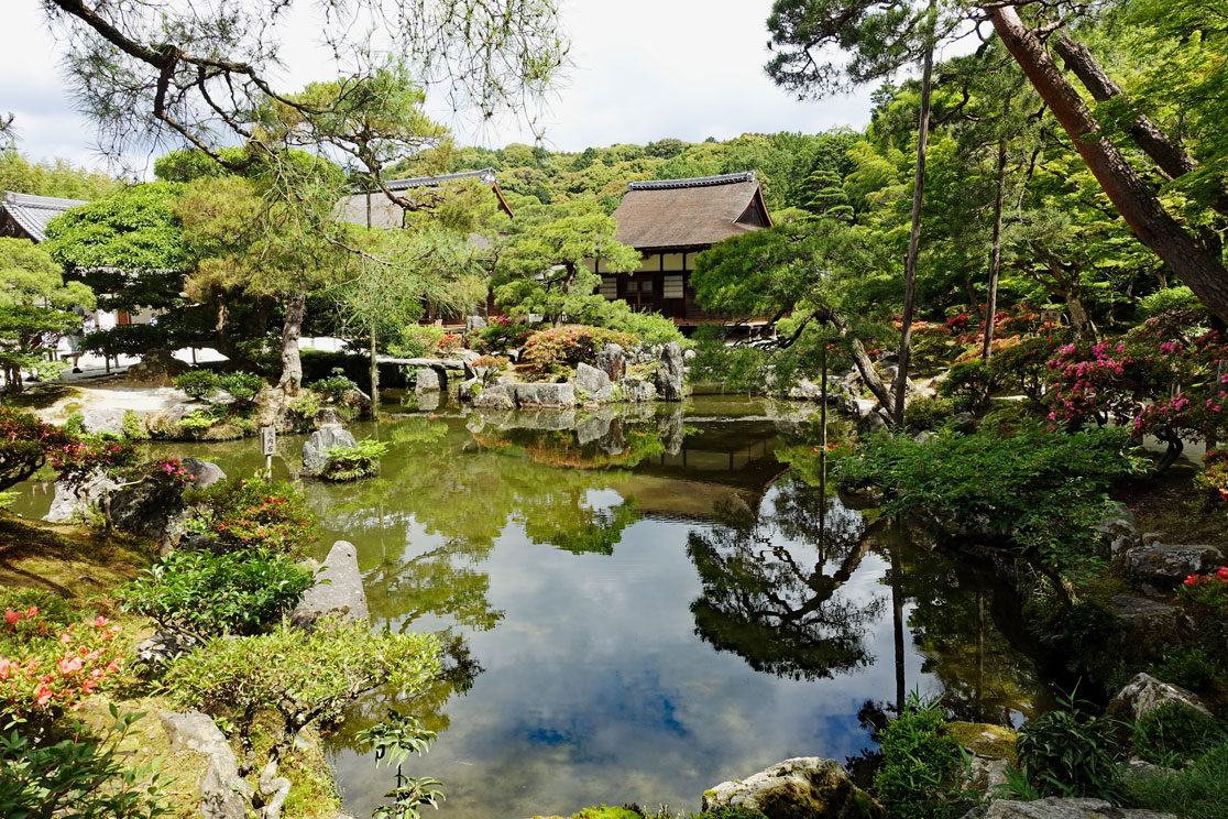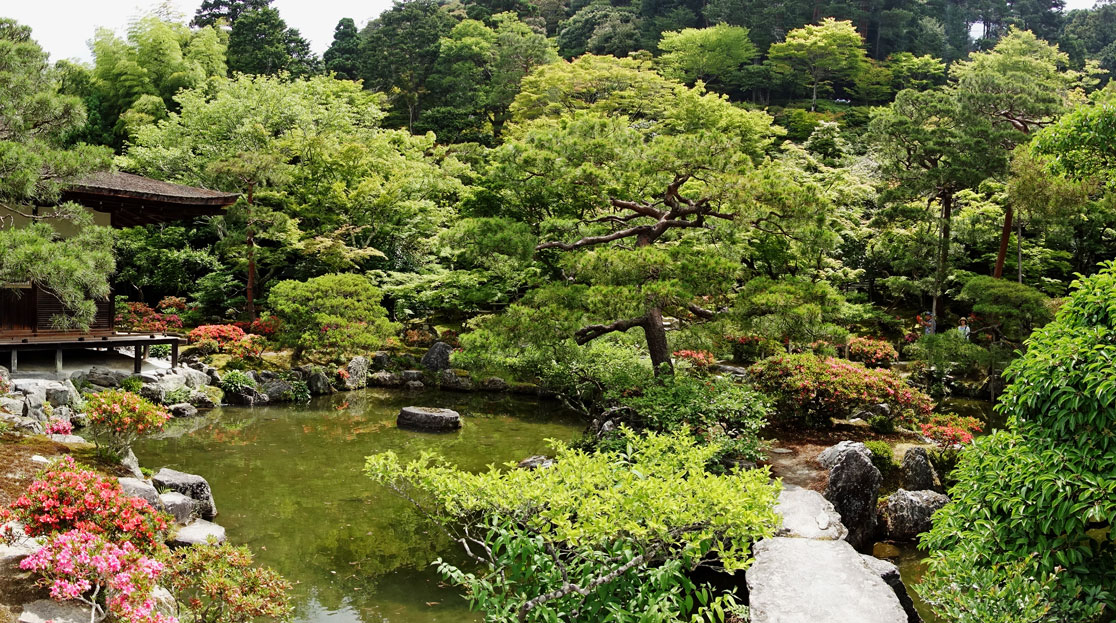 Am Eingangsschild vom Ginkaku-ji, dem Silbernen Pavillon, hält Shin-itchi einen Einführungsvortrag. Er erklärt uns, dass dieser Palast als geheimer Zufluchtsort eines Shoguns errichtet wurde. Zu Ehren seines Großvaters, der den Goldenen Pavillon bauen ließ, wollte dieser im 15. Jahrhundert den Silbernen Pavillon errichten. Leider hatte er wegen vieler kriegerischer Auseinandersetzungen nicht genug Geld, um die Wände mit Silber überziehen zu lassen. Dennoch ist die Gartenanlage wirklich sehenswert und gilt weltweit als klassisches Beispiel japanischer Gartenkunst. Das muss ich auch anerkennen und habe deshalb in der folgenden Fotoshow meine schönsten Gartenfotos vom Ginkaku-ji Pavillon zusammengestellt: