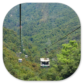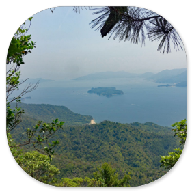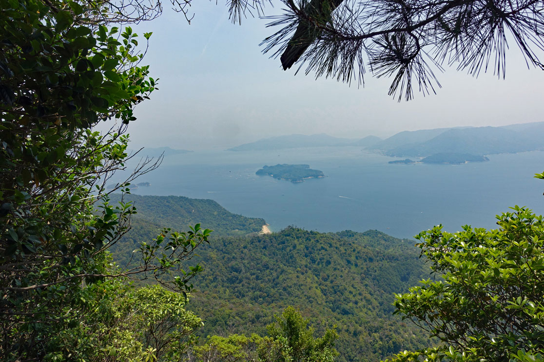 Sehr ausführlich erklärt uns unser Reiseführer den Schrein und die Bedeutung der Figuren. Auf der Insel gibt es viele Wanderwege, deshalb ziehen wir jetzt los zur Seilbahn und fahren mit ihr auf die oberste Plattform. Unterwegs müssen wir noch in eine andere Gondel umsteigen. Von oben hat man einen hervorragenden Blick auf die umliegenden kleinen Inseln, aber leider ist es ziemlich diesig an diesem Vormittag, sodass die Fotos nicht optimal sind.