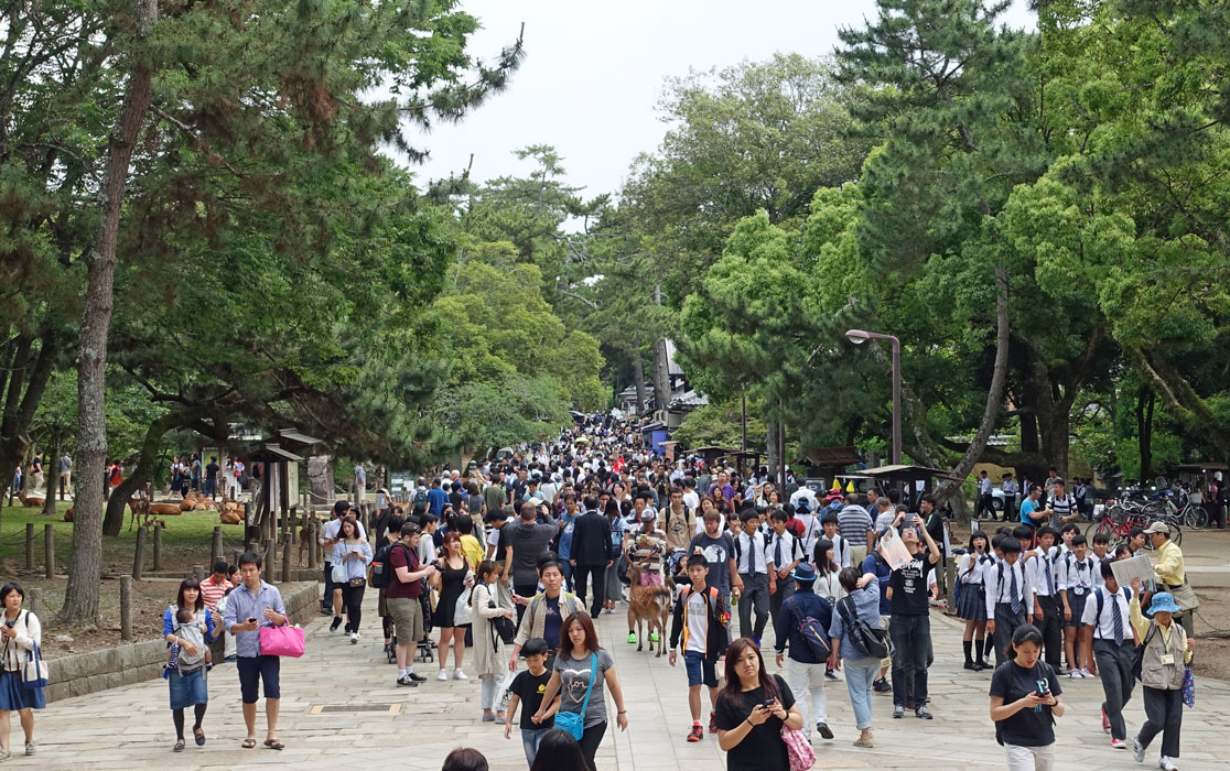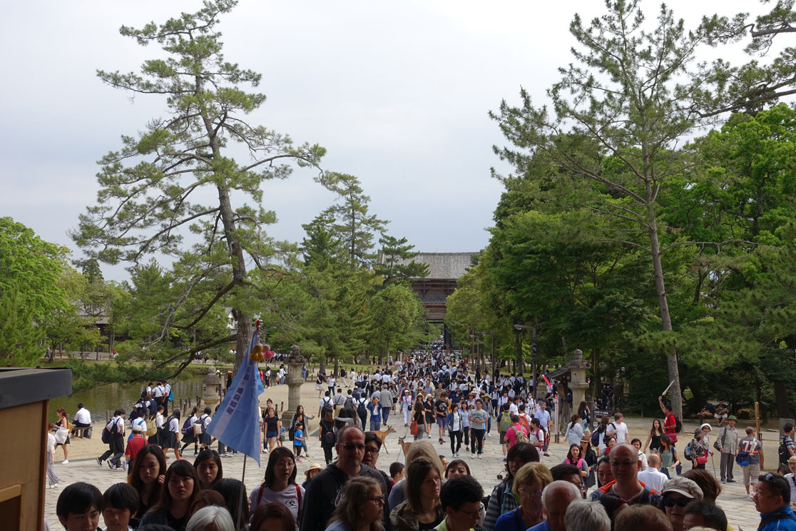Was uns vor allem beim Betreten des Nara-Parks beeindruckt, ist die riesige Menschenmenge, die sich durch die Parkwege schiebt. Eine kleine Bilderfolge verdeutlicht hoffentlich ein bisschen unsere Beobachtungen: