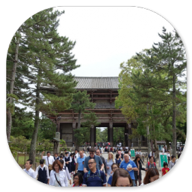 Meistens sind es Schulklassen, wie man an den Uniformen sieht, aber es sind auch viele Familien mit Kindern hier. Im Gegensatz zu den touristischen Plätzen, die wir bisher besucht haben, fallen uns jetzt statt der Ausländer viel mehr Japaner auf, die einen Sonntagsausflug in diese Stadt machen. Für die Japaner ist die riesige Tempelanlage, die UNESCO Weltkulturerbe ist, natürlich von großem Interesse und ein religiöser Zielpunkt. Die große Halle ist vermutlich der größte Holzbau der Welt und eine architektonische Leistung der damaligen Zeit. Sie wurde nämlich schon im Jahre 752 gebaut und musste so groß sein, damit die 16m hohe Buddha-Statue auch hinein passte.