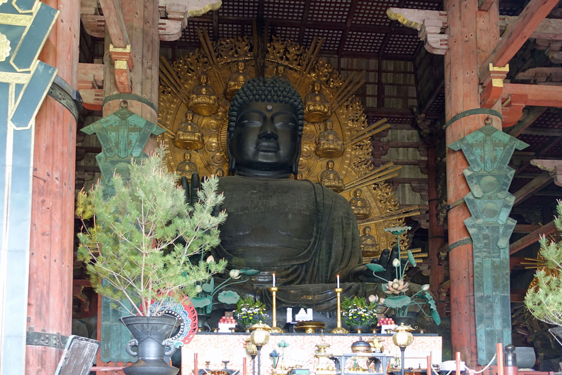 Um 14:00 Uhr sind wir dann endlich in Nara. Wir besichtigen das größte Holztor der Welt und den größten Holztempel der Welt: Es ist der Todai-ji Tempel aus dem Jahre 752 mit der 16 m hohen Buddhastatue.