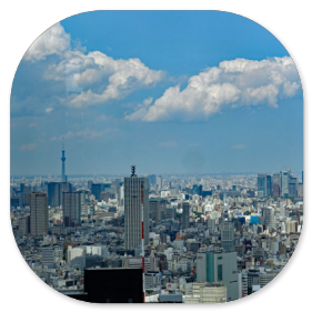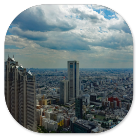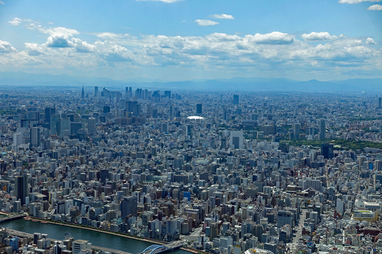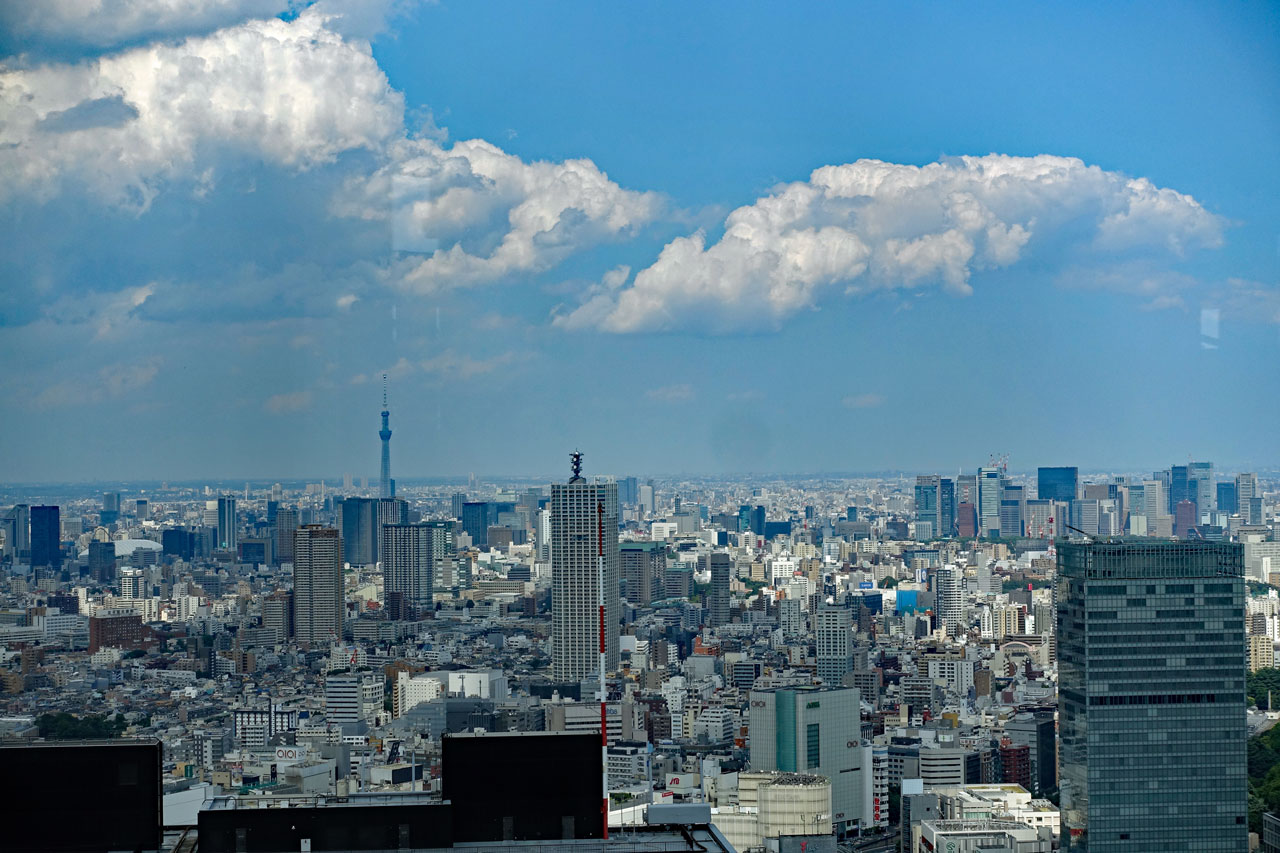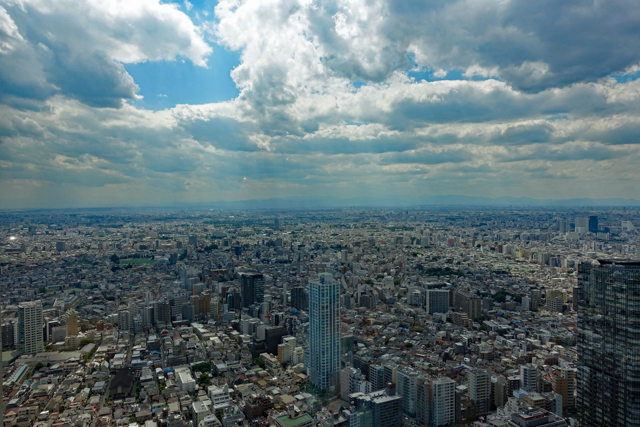 Durch einen Tunnel gelangt man in das 243 m hohe Rathaus von Tokio, das ebenfalls einen gewaltigen Verwaltungskomplex darstellt. Dort kann man kostenlos in die 43. Etage hinauffahren, wo man einen fast 360° Rundblick über die Stadt hat. Leider kann man nur durch die Fenster fotografieren. Hier einige Fotos davon: