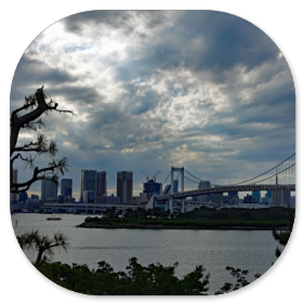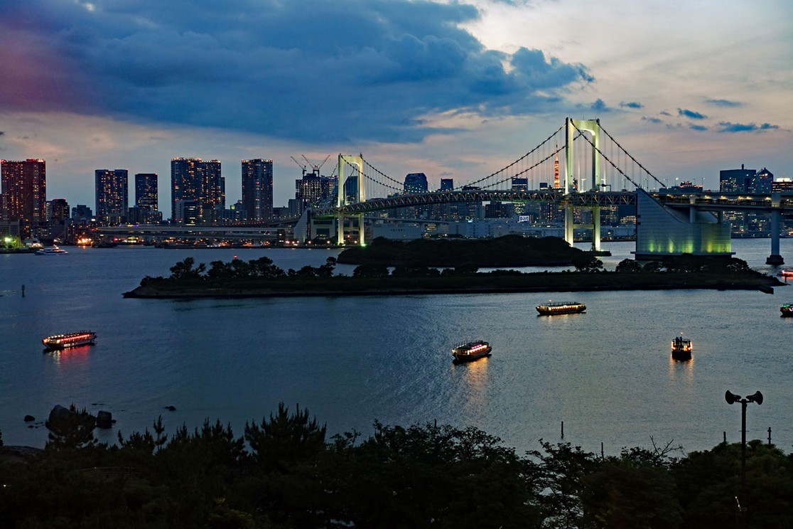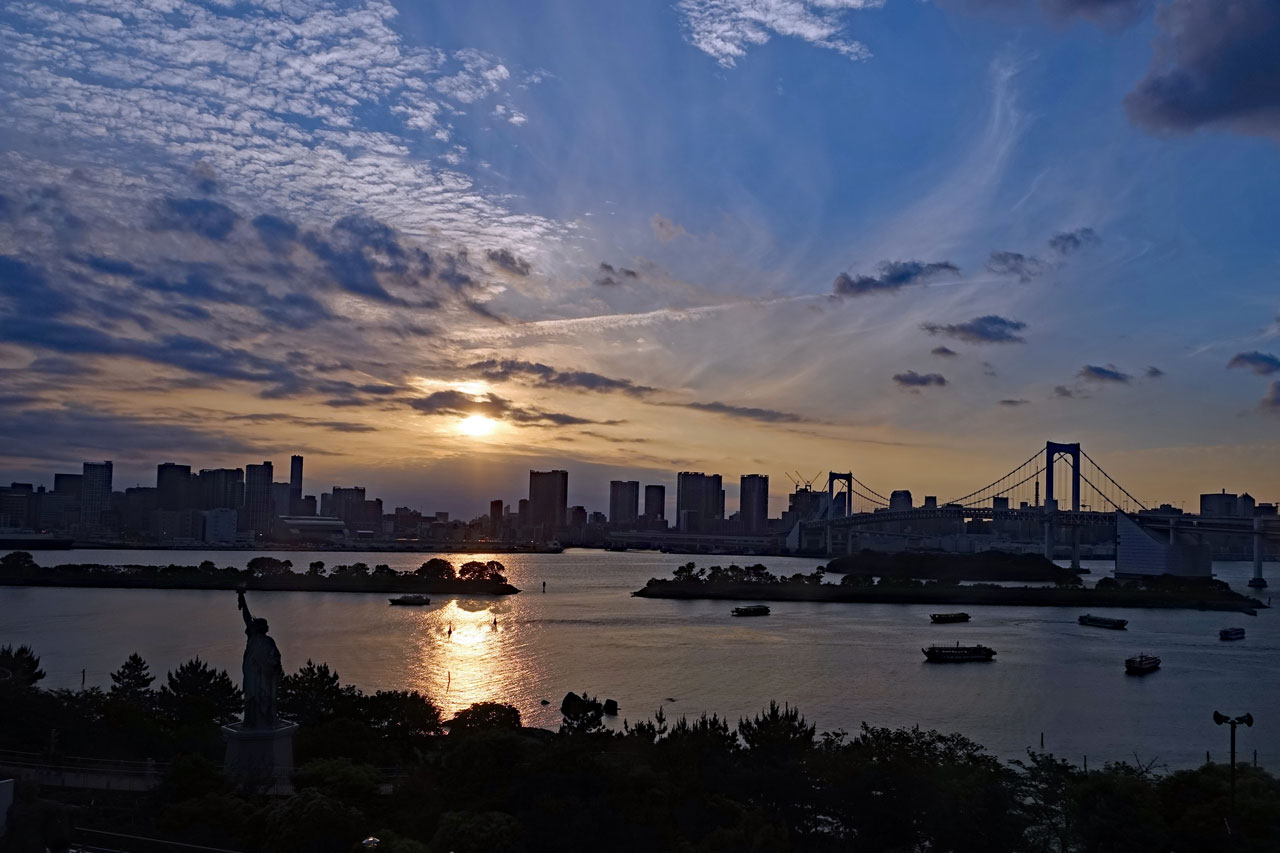 Die Sonne scheint nur noch vereinzelt durch die sich langsam zuziehenden Wolken, als wir um 16:00 Uhr in Odaiba anlegen, aber der Blick auf die Rainbow Bridge ist doch sehr malerisch: