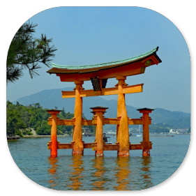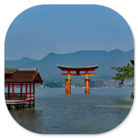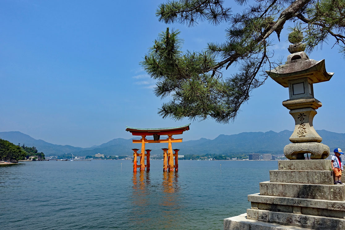 Mit dem Bus sind wir in 20 Minuten an der Anlegestelle der Fähre, die hinüber zu der heiligen Insel führt. Die Insel mit dem Itsukushima-Schrein gehört zu den bedeutendsten Sehenswürdigkeiten Japans. "Itsukushima" heißt auf Deutsch "Tabu-Insel" und das bedeutet, dass auf der Insel keine Bäume gefällt und keine Tiere erlegt werden dürfen. Es gibt auf der Insel sogar noch Berg-Urwald und die kleinen japanischen Hirsche laufen frei herum. Für viele Japaner ist Miyajima ein bevorzugtes Ausflugsziel.