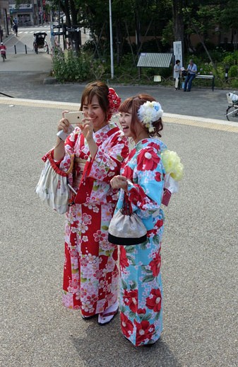Um 15:10 Uhr fahren wir weiter zum Gijon-Distrikt und in die Altstadt von Kyoto, wo viele japanische Restaurants sind und Geikos und Maikos zu finden sind. Wir hoffen natürlich, eine Geisha zu sehen und fotografieren zu können. Wir werden von unserem Reiseführer darüber aufgeklärt, dass die schön gekleideten Kimono-Passanten gar keine Japanerinnen sind, sondern Touristinnen aus China oder Korea, die sich einen Kimono für einen Tag geliehen haben und damit durch die Stadt spazieren. Ihre wichtigste Aufgabe besteht darin, vor bestimmten Gebäuden mit dem Smartphone Selfies zu schießen und diese per Whatsapp nach Hause zu schicken. Auf dem linken Bild sieht man also deutlich den Unterschied zwischen europäischen Touristinnen auf der linken Seite und asiatischen Touristinnen auf der rechten Seite.