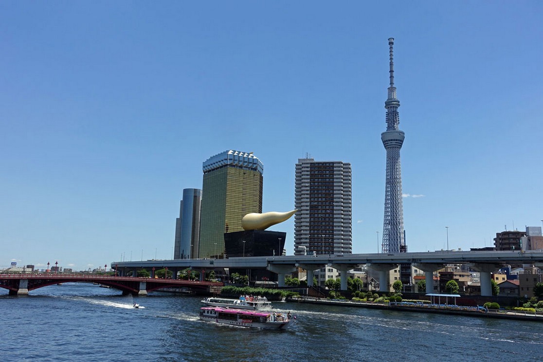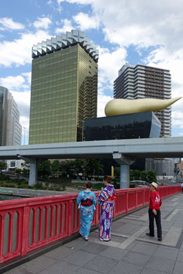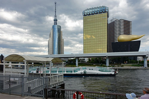 Im Vordergrund ist der Sumida Fluss und als wir das Ausflugsboot sehen, beschließen wir, unbedingt heute Nachmittag auch damit zu fahren, denn es ist wunderschönes Wetter.Zunächst rätseln wir aber über den riesigen goldenen Gegenstand , der sich auf dem schwarzen Hochhaus befindet, das vor dem goldenen Asahi-Tower steht. Manche aus unserer Gruppe glauben, dass es ein großer Rettich ist. Unser Reiseleiter klärt uns aber aucf, dass es die Flamme des Lebens darstellen soll.