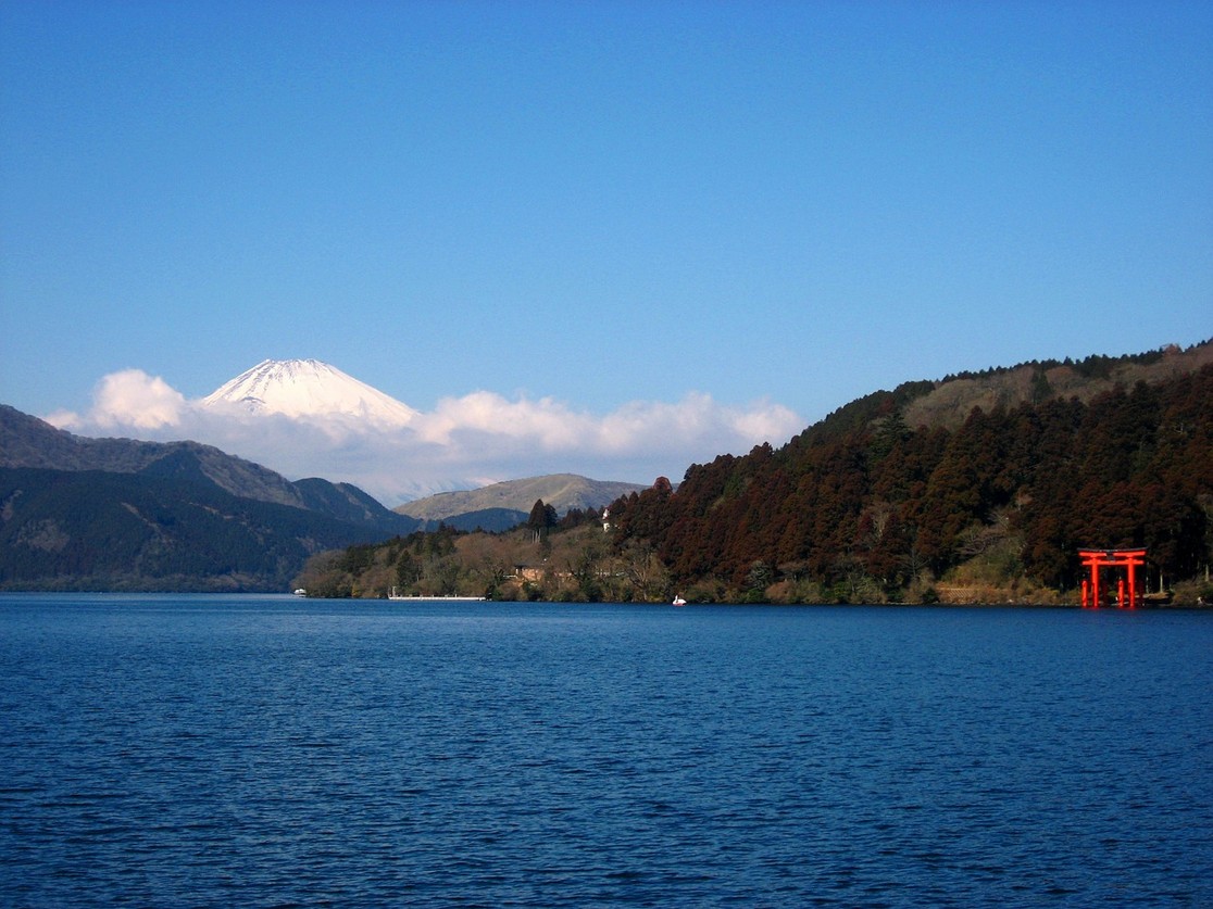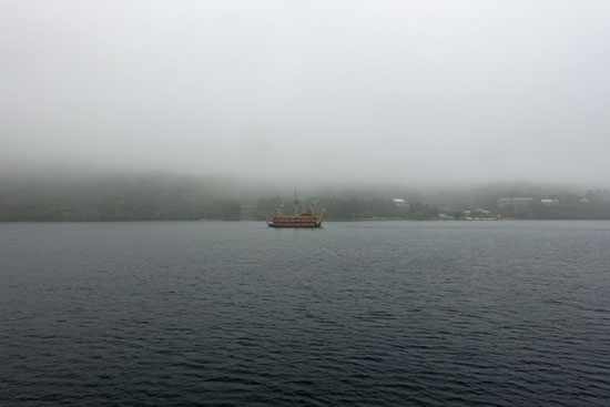 Wir versuchen wie alle Besucher den Fujiyama hinter der Bergkette im Wolkendunst zu erspähen, aber es gelingt uns nicht, obwohl auf der Aussichtsplattform eine Hinweistafel angebracht ist, wo er zu lokalisieren ist.
