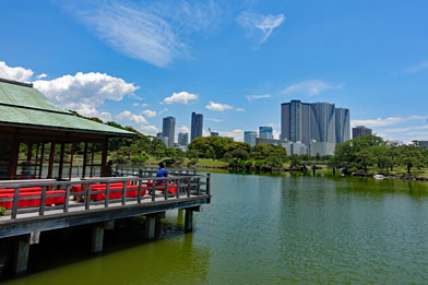 Nicht nur auf dem Fischmarkt beobachten wir, dass die Japaner einen übersteigerten Hygienekult haben, sondern überall auf den Straßen: Es liegt kein Müll herum, keine Zigarettenstummel, kein Kaugummi, keine Graffitis - alles ist sauber. Das beeindruckt uns immer wieder. Vor allem, dass es keine Müllbehälter auf den Straßen und Plätzen gibt - jeder nimmt seinen Müll mit nach Hause und entsorgt ihn dort. An den Versteigerungshallen des Fischmarktes entlang spazieren wir bis zum Hama-rikyu Garten, der berühmt für seinen Teich und das Entenjagdrevier ist. Da das Teichwasser direkt aus dem Meer kommt, ist auch Ebbe und Flut zu beobachten. Es ist der einzige aus der Edo-Zeit erhaltene Teich dieser Art.