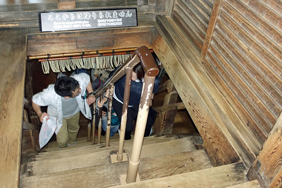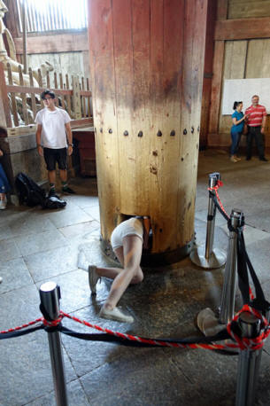 Eine Vorstellung von den dicken Holzsäulen kann man sich machen, wenn man auf dem rechten Bild solch eine Holzsäule sieht, durch die man einen engen Durchgang geschaffen hat. Wer sich durch die Öffnung zwängen kann, der findet angeblich die Erleuchtung und kommt ins Nirwana. Das schaffen aber meist nur schmächtige Japaner oder Kinder, die einen großen Spaß daran haben, hindurch zu kriechen. Eine lange Warteschlange steht an der markierten Säule, denn alle wollen ihr Glück versuchen. Wir haben lauf gelacht und viele Videos gedreht, wenn dickliche chinesische Touristinnen versucht haben, sich hindurchzuzwängen.