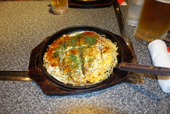Die Pizza wird in einer heißen Pfanne serviert. Wir sind total begeistert, weil die "japanische Pizza" hervorragend schmeckt. Außerdem haben wir Messer und Gabel erhalten, weil das doch mit den Stäbchen nicht so einfach ist. Es wird nämlich dazu eine besondere Okonomiyaki Sauce serviert, die wie eine gute Grillsauce ausgezeichnet dazu passt. Mit einem kühlen Bier (0,35 l für 580 Yen) sind wir sehr zufrieden, zumal wir am Ende nicht mehr als 18 Euro pro Person an der Kasse am Ausgang bezahlt haben. Das Leben in Japan ist also doch nicht so teuer, wenn man die richtigen Restaurants und das richtige Essen auswählt. Da es kein Trinkgeld gibt, ist Japan also nicht teurer als Frankreich oder England.