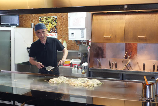 Am Abend erkennen wir trotz der Mängel des Hotels doch den Vorteil, dass es mitten im Zentrum von Hiroshima liegt und wir zu Fuß zur überdachten Fußgängerzone spazieren können. Auf dem Bürgersteig sind teilweise Orientierungszeichen, sodass wir alles leicht finden. Auch die Nebenstraßen sind so angelegt, dass wir leicht zur Hauptstraße zurückfinden können. In den kleinen Gässchen neben der Fußgängerzone ist das schon schwieriger. Aber da wir den Namen des Restaurants kennen, ist es etwas einfacher. Unser Reiseführer Shin-itchi hat zum Abschluss des Rundgangs durch den Friedenspark gefragt, ob wir die berühmte "Japanische Pizza" kennenlernen wollen, die gerade hier in Hiroshima in einer besonderen Variante zubereitet wird. Dem haben wir freudig zugestimmt. Daraufhin hat er uns kleine Zettel vorbereitet, auf die er auf japanisch aufgeschrieben hat, ob wir die "Okonomi-yaki" mit Fleisch oder Meeresfrüchten haben wollen. Diese Zettel sollen wir dem Kellner geben, wenn er an den Tisch kommt und fragt, was wir gerne essen möchten. Er hat uns auch eine Anleitung mitgegeben, wie wir uns anhand der eingelegten Symbole auf den Bürgersteigen orientieren können, um in die überdachte Fußgängerzone vonm Hiroshima zu kommen.. Das gelingt uns auch und wir sind ganz stolz darauf, endlich das beschriebene Restaurant gefunden zu haben. Als wir im Restaurant sitzen bestellen wir erst einmal ein "Biru" (Bier) zum Trinken. Von unserem Platz aus können wir die fast vier Meter lange heiße Eisenplatte sehen, auf der zwei Köche aus Teig Fladen braten, darüber gedünstetes Gemüse geben und alles zusammen mit Gehacktem und Nudeln einwickeln und mehrmals wenden. Das sieht sehr appetitlich aus.