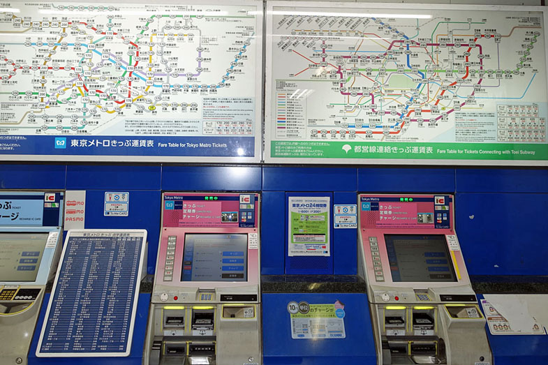 Der blaue Übersichtsplan an der Wand zeigt die Tokyo Metro Linien. Die Zahlen an den Stationen geben den Preis an, den man am Ticket-Automaten eingeben muss, um eine Fahrkarte dorthin zu lösen. Für sie muss man auch die Tickets an dem Automaten lösen, der darunter steht. Glücklicherweise kann man die Anzeige der Automaten auf Englisch einstellen. Auf der rechten grünen Anzeigetafel sieht man den Streckenplan der Toei Subway.