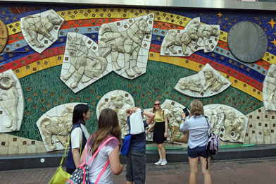 In einem Bahnhof, in dem täglich zigtausende Menschen auf verschiedenen Ebenen ein- und aussteigen, ist es natürlich nicht einfach, den richtigen Bahnsteig zu finden. So fahren auch wir erst einmal einige Rolltreppen hinauf und hinunter, um den richtigen Bahnsteig für den Zug nach Shibuya zu finden. Nach erneuter Sucherei nach dem richtigen Bahnsteig im Bahnhof gelangen wir mit Umsteigen nach einer halben Stunde in den eigentlich gar nicht so weit entfernten Stadtteil Shibuya, der einen ähnlich großen Bahnhof mit so vielen Fahrgästen hat wie Shinjuku. Als wir aus dem Bahnhof herauskommen, stehen wir direkt auf der berühmten Kreuzung Shibuya Station. Viele Touristen fotografieren die Bronzestatue und das Wandbild des treuen Hundes Hachiko. Die Geschichte des Hundes Hachiko können Sie im Internet nachlesen. Sie ist rührend und ein Symbol der Japaner für Treue geworden.Wesentlich interessanter ist aber der Blick über eine der verkehrsreichsten Kreuzungen der Welt. An der Shibuya Station Kreuzung überqueren während der grünen Ampelphase von 90 Sekunden in der Regel mehrere Tausend Menschen die Zebrastreifen, die längs und quer über die Straße gemalt sind. Zu Spitzenzeiten sollen es mehr als 15000 sein.