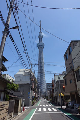 Beim Gang durch die Straßen um den Tower fällt uns auf, dass sehr viele elektrische Leitungen oberhalb der Erde verlegt sind und oft kreuz und quer über die Straße gespannt sind. Wir kennen so etwas nur aus Thailand oder Indien und wundern uns, wo doch Japan genügend Geld für eine unterirdische Verlegung besitzt.. Auf Nachfrage erklärt man uns, dass auf diese Weise Kabelbrüche nach Erdbeben sehr viel schneller repariert werden können als bei unterirdischer Verlegung. Das leuchtet ein.