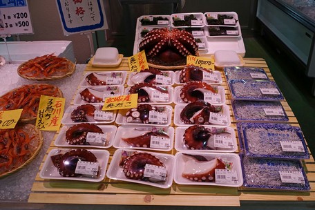 Im Reiseführer haben wir gelesen, dass Besucher nur bis 9 Uhr eingelassen werden, aber für die Versteigerungen ist es jetzt sowieso zu spät, da es schon halb elf ist. Um die Versteigerung richtig zu sehen, hätte man aber schon um 6 Uhr morgens kommen müssen. Jetzt haben auch die meisten Hausfrauen bereits an den Fischgeschäften bereits eingekauft und der innere Markt ist geschlossen. Es ist nur der äußere Markt zugänglich, der aber ein Anziehungspunkt für sämtliche Touristen ist, denn hier gibt es alles, was sich japanische Feinschmecker für ihre Küche wünschen. Es wird hier nicht nur Fisch, Obst und Gemüse angeboten, sondern alles, was rundum für die Küche erforderlich ist: Messer, Töpfe, Schalen, Gewürze, Geschirr und andere Artikel. An den Verkaufsständen ist unheimlich viel Betrieb. Alles ist supersauber und wird eisgekühlt oder direkt auf Eis serviert. Die meisten Nahrungsmittel werden sofort mundgerecht geschnitten und auf Schalen mit Beilagen und Saucen zum direkten Verzehr angeboten. Da die Japaner mit Stäbchen essen, müssen die Stücke auch entsprechend klein sein. Die Auswahl an Fischen, Muscheln und anderem Seegetier ist unermesslich. Die Preise sind allerdings unerhört: Ein Kilo Thunfisch kostet umgerechnet zwischen 48 und 60 Euro, ein Bund mit 3 Stangen Spargel 4 Euro und eine Melone zwischen 8 und 16 Euro. Hier einige Eindrücke vom Fischmarkt: