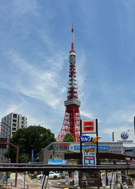 Nach den beiden Rundfahrten nehmen wir wieder die violette Linie und steigen am Tokyo Tower aus, wo wir zwei Tickets für jeweils 900 Yen ( = 7,20 €) lösen. Als wir fragen, warum der Tokyo Tower dem Eiffelturm so ähnlich sieht, antwortet man uns freimütig, das sei vollkommen richtig. Er sei zwar dem Eiffelturm nachgebaut, aber eben viel schöner. Es wäre eine Eigenart der Japaner, besonders gute Vorbilder nachzuhmen und besser zu machen. Die Sicht von oben aus der Plattform von 230 m Höhe ist beeindruckend, zumal das Wetter sehr gut ist. Man kann bei einem Blick nach Osten sogar den Sklytree sehen. Ich schieße unendlich viele Fotos.