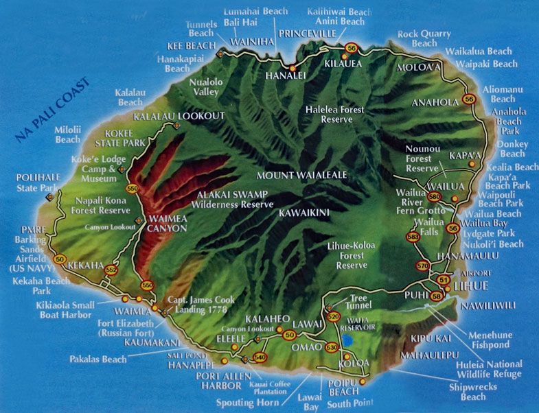 Wie auf den anderen hawaiianischen Inseln auch führt eine große Straße rund um die Insel - allerdings eben nicht ganz herum. Das ist ganz wichtig zu wissen, wenn Sie sich einen Standort für Ihr Hotel oder eine Ferienwohnung aussuchen. Da Sie sicher die Hauptattraktionen der Insel besuchen wollen, müssen Sie unter Umständen mehr als eine oder zwei Stunden Fahrzeit dorthin einkalkulieren. Ich selbst schlage deshalb immer Kapaa vor, weil man von dort aus in 40 Minuten sowohl an der Nordküste in Princeville wie auch ebenfalls in 40 Minuten an der Südküste in Poipu ist.