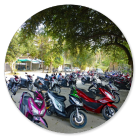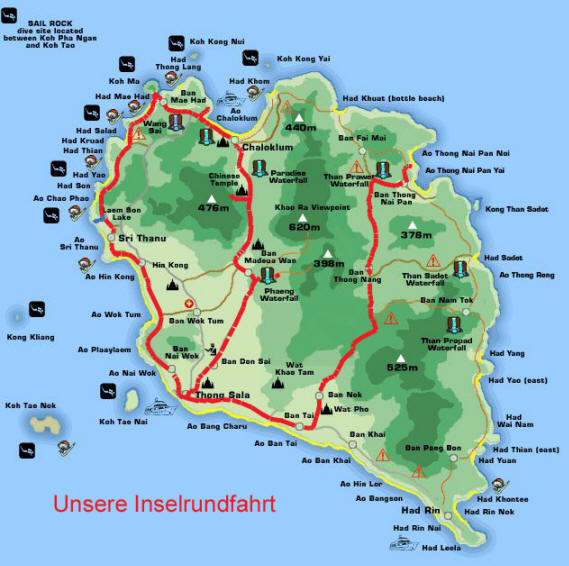 Haad Rin am südlichen Ende lassen wir weg, weil wir nicht zur Zeit des Vollmonds da sind und infolgedessen auch keine Fullmoon-Party am Strand stattfindet. Ansonsten hätten wir uns das schon gern angeschaut.Da die Insel nicht sehr groß ist, einigen wir uns schließlich auf eine vierstündige Rundfahrt über die Insel gemäß der eingezeichneten Route auf der Karte und behalten uns vor, auch eine längere Zeit einzuplanen, wenn es uns irgendwo besonders gut gefallen sollte.