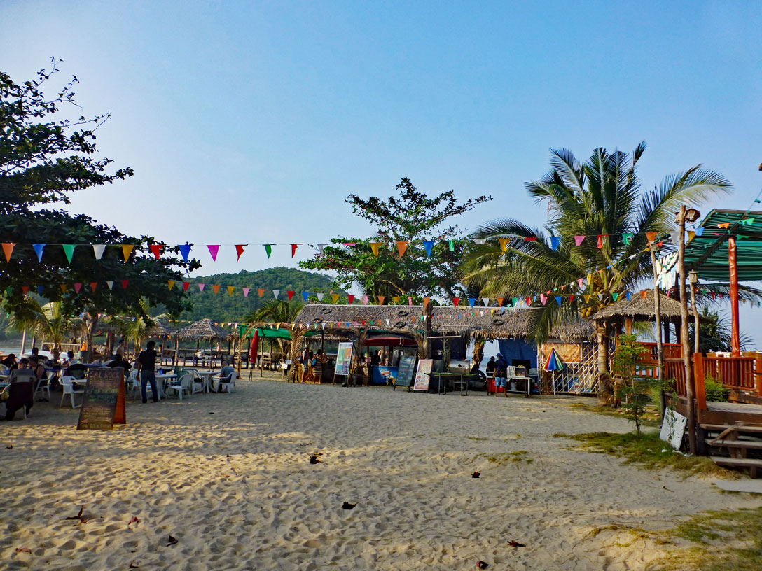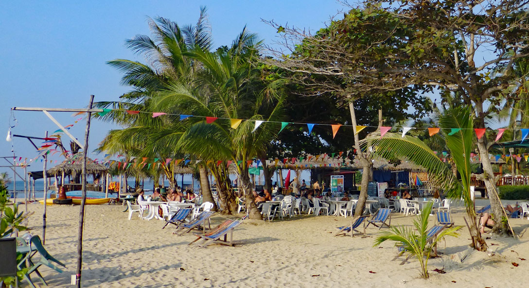 An dem sehr breiten Strand mit feinem Sand begrüßt uns ein lebhaftes, bunt geschmücktes Strandrestaurant; dazwischen gibt es Unmengen von Angeboten, die auf Tafeln angepriesen werden. An den ziemlich einfachen Bungalows, die auf dem hinteren Bereich des Strandes stehen, hängt viel Wäsche zum Trocknen. Man merkt, dass viele Backpacker hier wohnen und es sich am Strand gemütlich machen. Sonnenschirme, wie wir sie an unserem Hotelstrand gewöhnt sind, findet man überhaupt nicht. Hier einige Bilder von unserem Strandspaziergang: