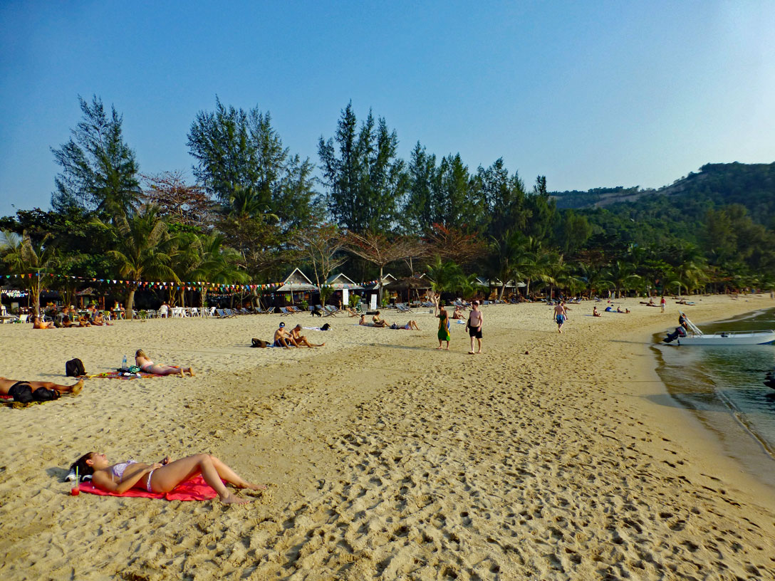 An der Rezeption lassen wir mit der Gepäckausgabe am Airport telefonieren und erfahren, dass unsere Koffer mit dem nächsten Speedboat kommen werden. Das wäre gegen Mittag der Fall.. Und als der Boy mit den Koffern vor der Tür steht, geht es uns direkt deutlich besser. Zwei Dollar Trinkgeld sind ihm gewiss. Dadurch wird natürlich auch der Nachmittag entspannter und wir können uns mit Badesachen auf die Liege legen. Das Wetter ist fantastisch und der Blick auf die Bucht Thong Nai Pan Noi auch: