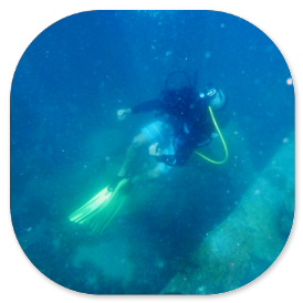 Der Felsen ist 15 Meter hoch und das Meer rings herum ist 35 m tief. Auch hier sollen Walhaie, Riffhaie und große Grouper zu sehen sein. Die Taucher unseres Bootes verteilen sich auf zwei Vierergruppen und eine Frauengruppe. Martin macht alle darauf aufmerksam, dass sie eng beieinander bleiben sollen, da die Sicht evtl. noch schlechter als bei Shark Island ist. Die Attraktion an diesem Felsen ist, dass es unter Wasser einen Eingang zu einer Höhle gibt. Dieser liegt in etwa 18 Meter Tiefe. Man kann dann im Innern hochsteigen und in 12 Meter Tiefe durch eine andere Öffnung wieder heraus schwimmen. Einen zweiten und größeren Ausgang gibt es noch in etwa 6 Meter Tiefe.