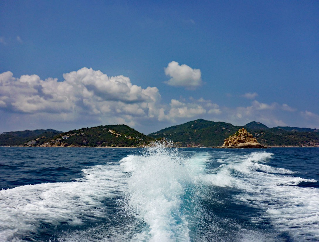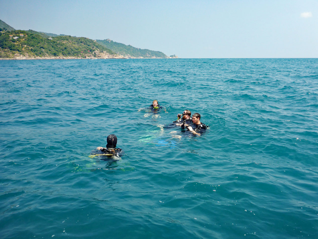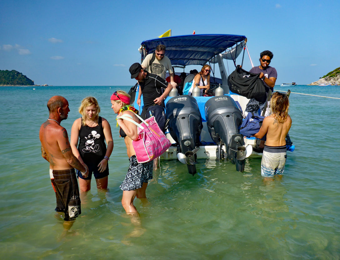Die Sonne scheint noch nicht richtig durch die Wolken, aber das Meer ist ruhiger geworden. Ich habe für heute einen ganztägigen Ausflug nach Koh Tao mit dem Speedboot gebucht. Neben dem Anantara-Hotel unterhält die Firma H2O -Divers einen kleinen Stützpunkt, wo ich für 2500 BHT den Ausflug buche. Alice, eine der beiden Geschäftsführer erklärt mir am Vortag, dass sie wegen des Wetters und der Anmeldungen die Route geändert hätten und nicht zum Schnorcheln an den Strand von Koh Tao führen, sondern zum Tauchen nach Shark Island und zum Sail Rock. Beides seien auch hervorragende Plätze, um viele Fische zu sehen und die Chance zur Begegnung mit Riffhaien und Walhaien sei sehr groß. Als Schnorchler wäre ich gern auf dem Boot gesehen und würde sicher auf meine Kosten kommen.
