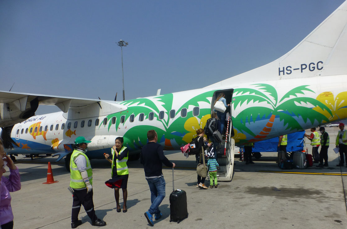 Die meisten Gäste müssen ihr Handgepäck abgeben, das gesondert verladen wird, weil die Gepäckfächer über den Sitzen zu klein sind. In der vollbesetzten Maschine sitzen fast alles Deutsche, Schweizer und Österreicher. Trotz der Klimaanlage sind es 29° C im Innern des Flugzeugs. Als die Propeller angeworfen werden, wird es kühler. Wir sitzen glücklicherweise vor den Propellern in der zweiten Reihe, aber dennoch ist der Krach gewaltig. Der scharfe Snack, der während des Fluges serviert wird, vermittelt einen ersten Eindruck von Thailand.