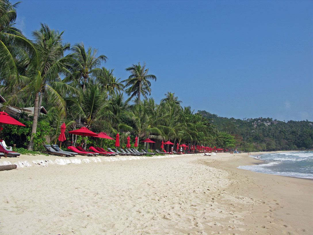 Blick auf die Bucht Thong Nai Pan Noi und das Buri Rasa Hotel. Die roten Sonnenschirme auf der rechten Seite gehören zum Anantara Hotel.
