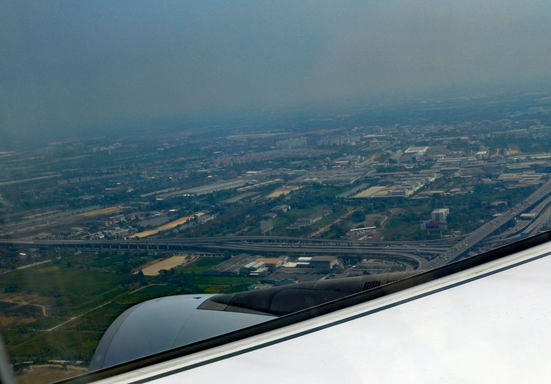 Beim Anflug auf Bangkok sieht man den grauen Smog, der über der Millionenmetropole lastet.