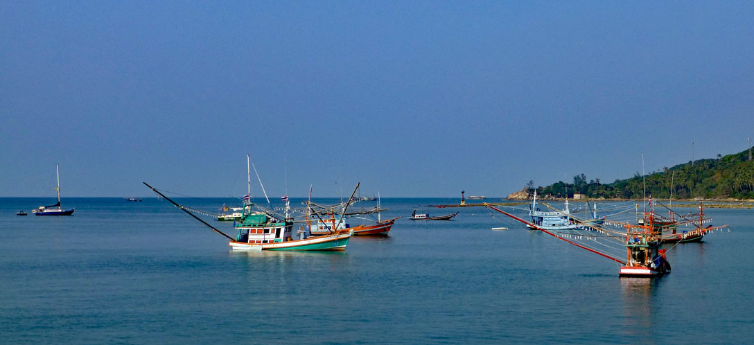 Unser nächstes Ziel ist die Bucht von Chaloklum ganz im Norden der Insel. Die Bucht ist riesig und der ideale Platz für einen Hafen. Es herrscht Ebbe und das Wasser ist niedrig. Besonders sauber ist es hier nicht, aber das Wasser ist total ruhig. Die Boote liegen überall vor Anker und unser Fahrer erklärt uns, dass hier vor der Küste vor allem Squids gefischt würden.