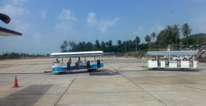 Witzig sind die offenen Transportbusse, mit denen die Fluggäste zum Terminal gefahren werden. Irgendwie vermitteln sie schon Ferienstimmung.