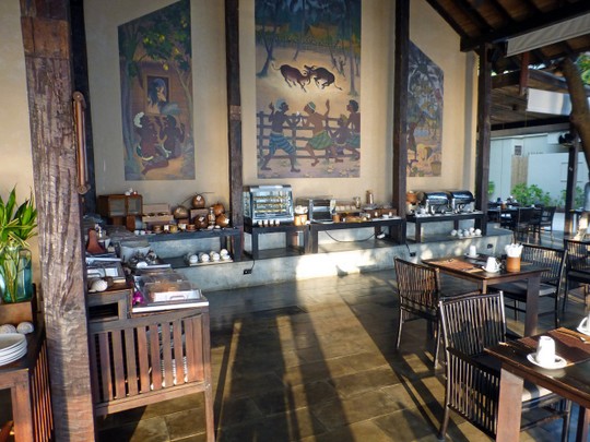 Ich spaziere durch den gepflegten Garten, schau mir das Frühstücksbüffet an und inspiziere den Pool. Das Büffet ist besser als bei uns, aber der Pool ist genau so mickrig wie unserer. Zwei Gäste, mit denen ich spreche, sind begeistert von ihrer Poolvilla, erklären aber, dass die kleinen Pools wohl eine gute Brutstätte für Moskitos sind , denn sie seien kräftig gestochen worden. Ihre Stiche sehen besorgniserregend aus. Aber sonst sind sie sehr zufrieden mit dem Hotel.