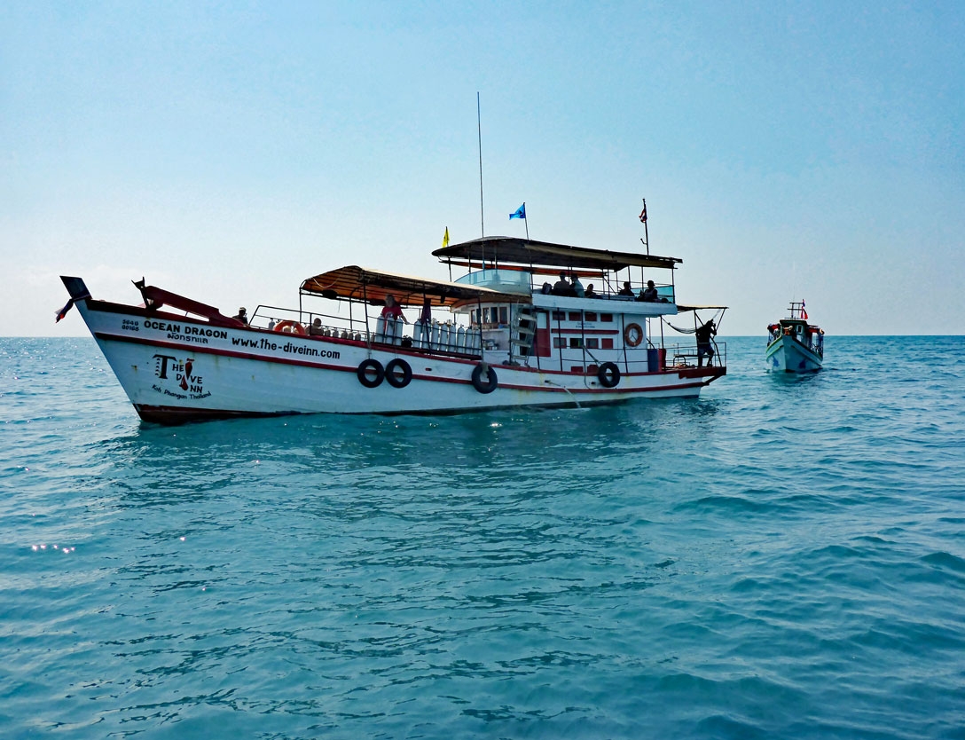 Nach einer Stunde sind wir vor Koh Tao und mein Nachbar erklärt mir, dass er hier gestern mit derselben Company am Ufer von Koh Tao schnorcheln war und total entsetzt war, dass ganze Busse von Japanern hier abgesetzt wurden. "Im Wasser waren nur Japse, keine Lachse", sagte er lächelnd. "Kleine bunte Fische, aber nichts Aufregendes." Für heute erwarte er wesentlich mehr von dem Tauchgang. Und seine Freundin auch, die gerade den Open Water -Schein machen wollte. Ich bin auch ganz gespannt darauf. Wir schwenken ab zu Shark Island, das ist eine kleine Insel, die südlich von Koh Tao liegt. Umgebaute Fischerboote mit Tauchern ankern vor der Insel: