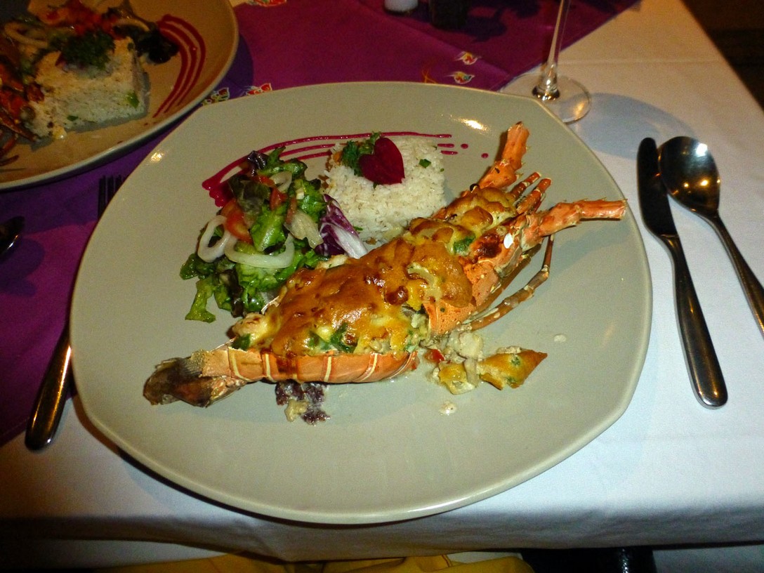 Um 19:30 Uhr sind wir wieder in unserem Hotel und genießen nach dieser Rundfahrt ein fantastisches Valentinsmenü in unserem Restaurant. An geschmackvoll gedeckten Tischen mit weißen Tischtüchern, Orchideen und einer roten Rose für die Damen gönnen wir uns von der Speisekarte den Lobster Thermidor mit einer gut gekühlten Flasche Hideaway Sauvignon Blanc aus Neuseeland. Der ist fantastisch und passt ausgezeichnet zum hervorragenden Lobster.