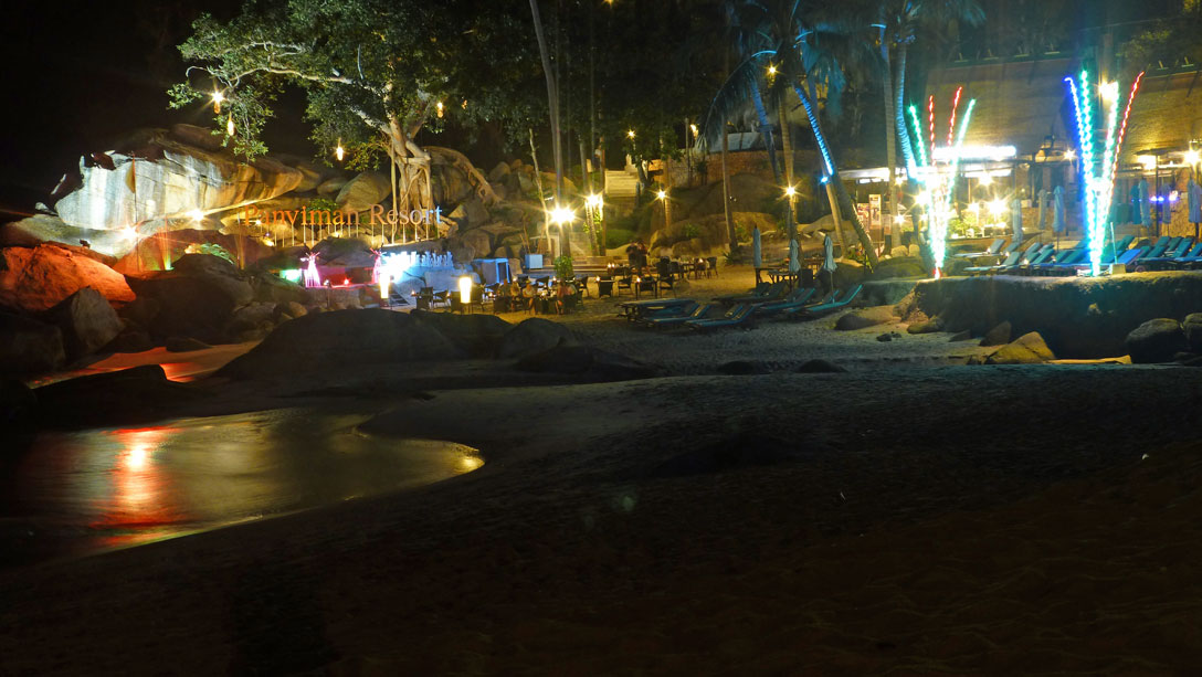 Wir setzen uns nicht in den Sand, sondern genießen das Abendessen auf der blank polierten Steinfläche des Restaurants. Es weht ein laues Lüftchen mit wenig Wind. Im Sand findet eine kleine Show mit Folkloretänzen statt, die wir schon besser in Bangkok gesehen haben. Vom Panviman Hotel nebenan klingen leise die Töne einer Liveband mit herüber, die drüben bei farbiger Beleuchtung auftritt.