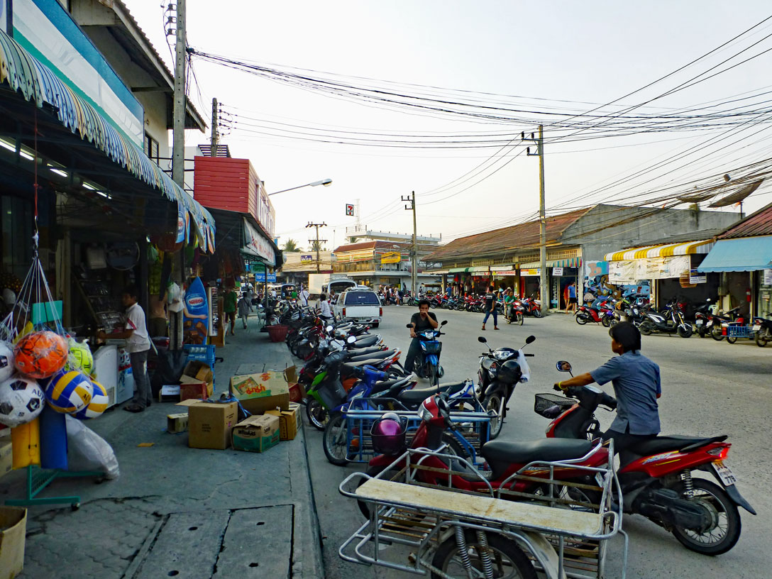 um halb sieben kommen wir nach Thong Sala und der Fahrer empfiehlt uns, doch hier shoppen zu gehen, denn das wäre der günstigste Ort zum Einkaufen in Koh Phangan. Er lädt uns mitten auf der Hauptstraße ab und wir ziehen los.