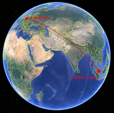Schneller geht es natürlich mit dem Flugzeug, wobei Malaysia Airlines die Strecke von 9937 km als einzige Fluggesellschaft mit einer Direktverbindung von Frankfurt aus in 12 1/2 Stunden bewältigt.