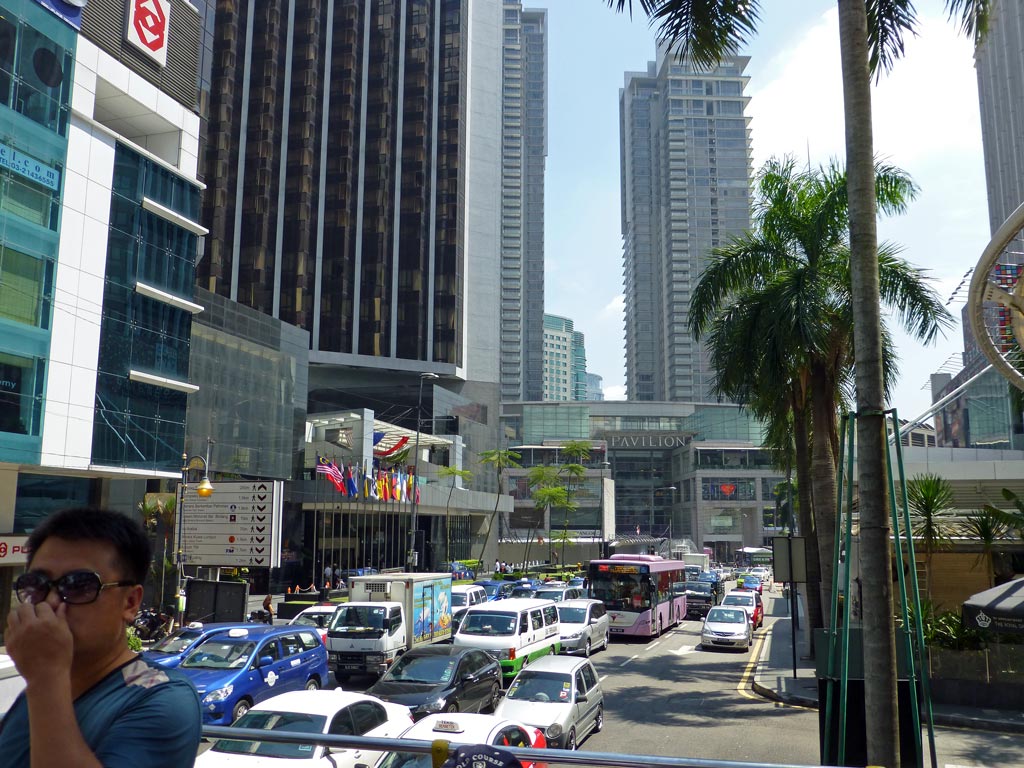 Kuala Lumpur hat nicht viele Sehenswürdigkeiten. Die Stadt ist zergliedert durch Autobahnen (teilweise mit mehreren Spuren übereinander), Monorail, Betonüberführungen, Kanäle und die beiden stinkenden Flüsse, die man jeweils in ein Betonbett gepresst hat. An Fußgänger wurde gar nicht gedacht, die müssen sich auf schmalen, kaputten oder fehlenden Bürgersteigen zurechtfinden, über die zudem die Moped- und Rollerfahrer sausen. Fahrräder haben wir überhaupt nicht gesehen, auch keine Elektroroller wie in China. Hier herrschen protzige Autos als Verkehrsmittel vor. Allerdings hupt kaum jemand, das ist erstaunlich; alles geht total gelassen vor sich: man wartet einfach, bis es weitergeht. Nur die Motorräder warten nicht, sie schlängeln sich an allen anderen Fahrzeugen vorbei und kommen immer weiter. Mit dem Energiesparen und dem Umweltschutz ist es hier noch nicht so weit gediehen; überall staut sich der Verkehr.