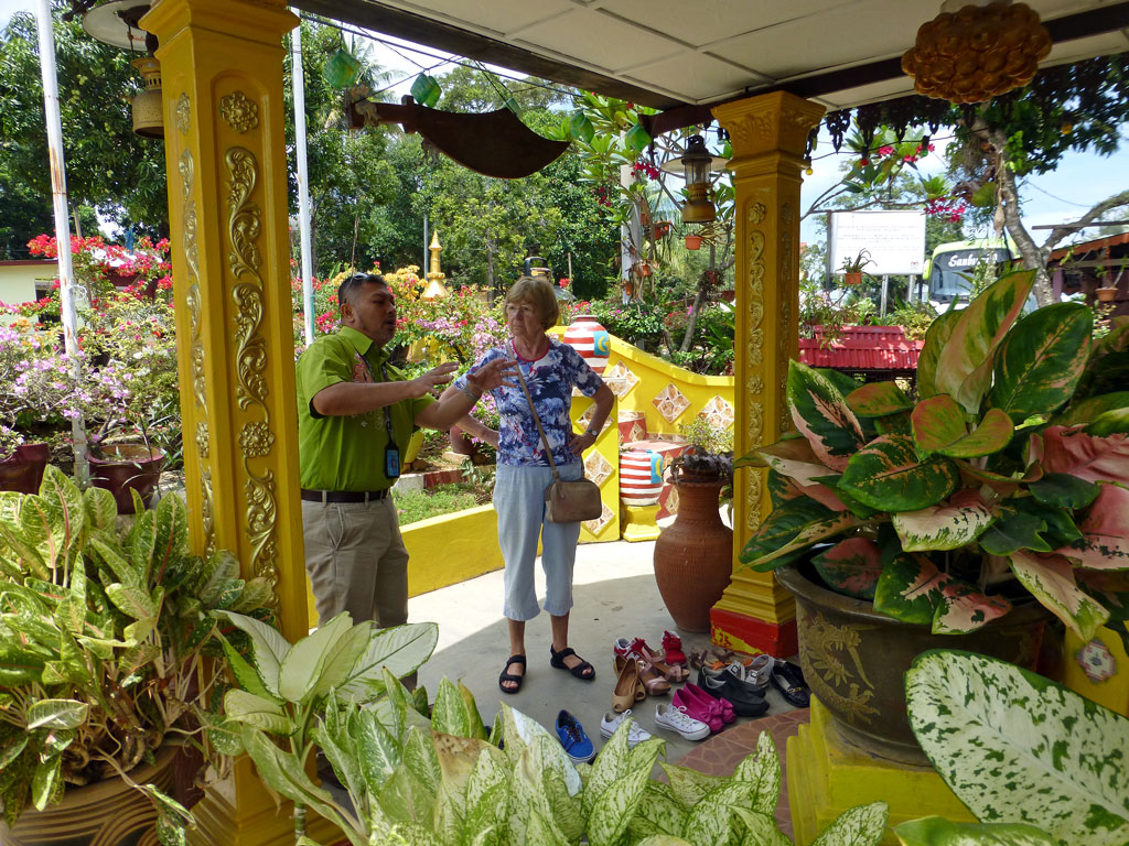 In Malakka besuchen wir als erstes ein typisches malaysisches Haus, wobei wir wieder über die Blütenpracht staunen. Zul erklärt uns die Eigenarten der Bauweise und warum wir die Schuhe ausziehen müssen.