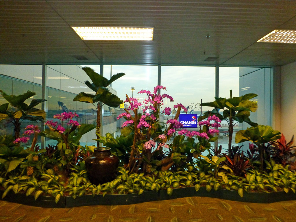 Der Flughafen ist nicht umsonst einer der schönsten der Welt: Orchideengärten empfangen uns; überall auf den Gängen blüht es, dazwischen gibt es farblich gestaltete Ruhezonen und Sanctuarien.