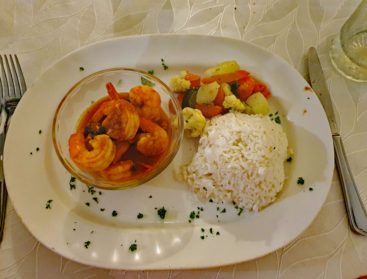 Der Fußweg von etwa einer Viertelstunde fiel kaum ins Gewicht und auf der Hauptstraße war die Auswahl ziemlich groß. Unser Barkeeper hatte uns natürlich das Villa Serena als bestes Restaurant des Ortes empfohlen, aber das wollten wir zunächst nicht glauben, weil es ja unser eigenes Hotel war. Als Alternative empfahl er uns das Restaurant "El Langostino de Oro", das wir bei einem Spaziergang durch den Ort besuchten.