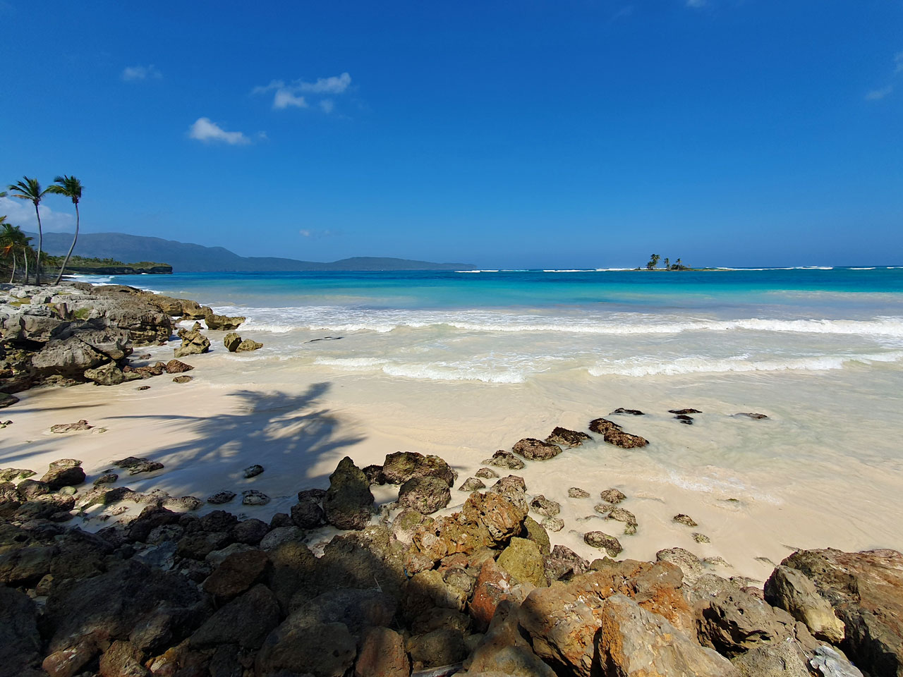 Übrigens ist das Meer zwischen der Insel und dem Strand nicht sehr tief; meist sind es nur 2-3 Meter. Dennoch sausen hier viele Fischerboote oder Wassertaxis vorbei, die von dem nahe gelegenen Strand Las Galeras zu den kleinen Nachbarstränden fahren.