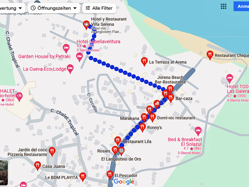 Das Angebot an Restaurants ist durchaus interessant, weil es hier auch im Jahre 2024 noch moderate Preise gibt. Die Karte von Google Maps ist dafür sehr hilfreich: