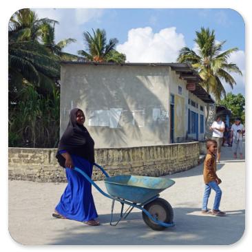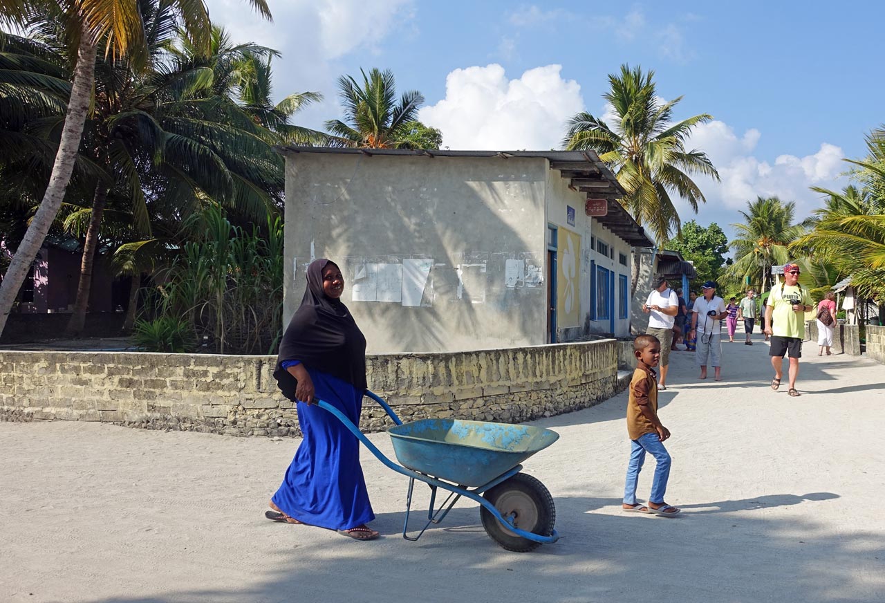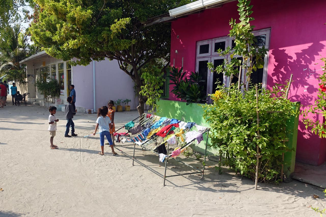 Die Kinder spielen fröhlich auf der Straße; von den 500 Einwohnern der Insel sind 92 Kinder. Im Unterschied zu den Kindern der anderen Inseln laufen sie nicht barfuß über die Straße, sondern haben Strandsandalen an den Füßen. Vor der Parteizentrale hat man eine Public-Viewing Leinwand eingerichtet, damit alle die Fußballspiele verfolgen können. Fußball ist die große Leidenschaft der Maldiver.