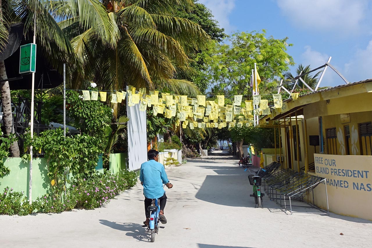 Drei Stunden später geht es weiter zu einer anderen Insel. Sie heißt Kamadhoo und wird von ca. 600 Maldivern bewohnt. Sie ist nicht weit weg von der Touristeninsel Landaa Giraavaru, auf der sich das Four Seasons Resort befindet. Deshalb arbeiten auch die meisten Bewohner in diesem Resort. Dort kosten die Bungalows für die Touristen 1000 Euro und mehr pro Nacht, sodass die Trinkgelder für die Bediensteten großzügig ausfallen und das Einkommen der Maldiver sehr hoch ist. Das merkt man schon bei der Einfahrt in den Hafen dieser Insel, der sehr viel besser befestigt ist und in dem ein reger Verkehr herrscht. Die gelbe Fahne ist das Wahrzeichen der Oppositions- Partei, die hier mit vielen Mitgliedern stark vertreten ist. Die gelben Fahnen finden wir auch auf der Dorfstraße vor dem Parteizentrum der MDP wieder.