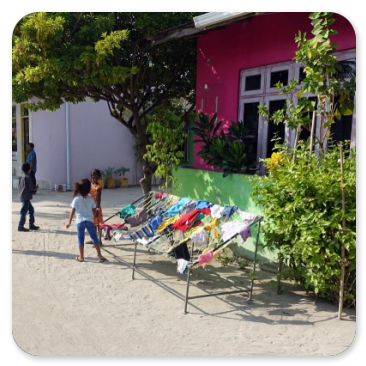 Wir spazieren durch die Dorfstraßen und laufen an verschiedenen Häusern entlang. Die Frauen legen Früchte und Fische zum Trocknen auf Wellblechplatten aus. Jedes Haus hat eine Satellitenantenne. Das Wasser wird entweder in großen Behältern aufgefangen oder kommt als Trinkwasser von den Resort-Inseln, die alle eine eigene Wasserentsalzungsanlage besitzen. Die Stromversorgung auf der Insel wird durch einen großen Generator sichergestellt, der mit Diesel betrieben wird. Zu jedem Haus gehört ein kleiner Garten, der ähnlich wie auf dem oberen Bild aussieht. Meist werden Gurken, Melonen und Papayas angebaut, manchmal auch eine spezielle Art von Kartoffeln.