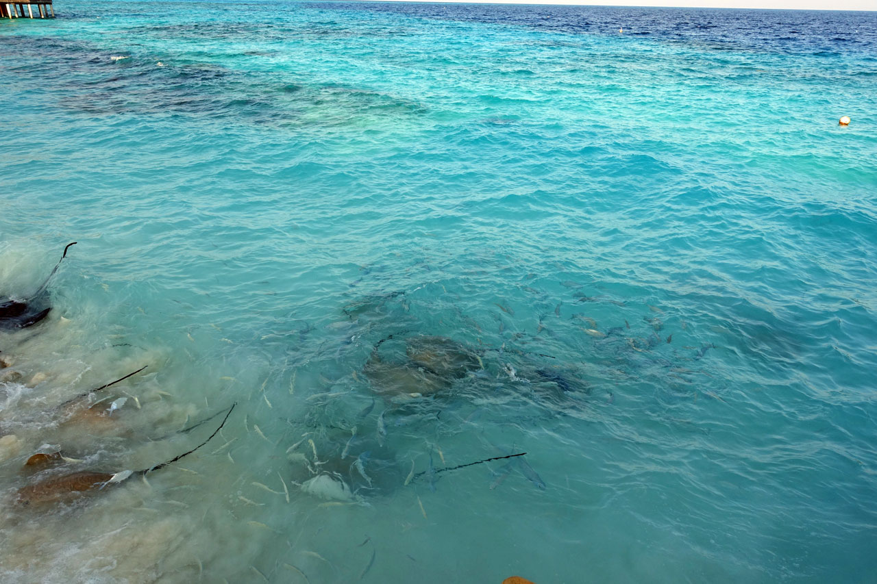 Schwärme von bunten Fischen sind zu beobachten. Es sieht wirklich aus wie in einem Aquarium. Allerdings sind die Korallen größtenteils abgestorben. Ich habe mir die kleine Unterwasserkamera mitgenommen und mache einige Aufnahmen. Eine halbe Stunde später schwimme ich durch den Durchgang bei den Wasservillen wieder an den Strand. Schade, dass es am Strand keine Duschen gibt, denn ich würde gern das Salzwasser von meiner Kamera und meinem Körper abspülen. Aber man muss immer in den Bungalow zurück und erst durchs Zimmer, um ins Bad zu kommen. Das ist ziemlich umständlich.